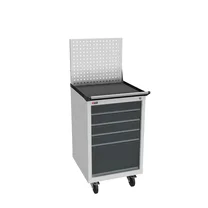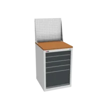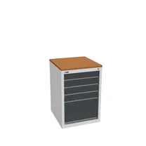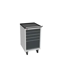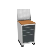 Инструментальная тумба с 5 ящиками: h100, h100, h100, h100, h300. Максимальная нагрузка на ящик — 60 кг. Телескопические направляющие. Укомплектована колесами, лотком, ручкой на лоток. Сварной корпус тумбы и корпус ящика. Общий замок, закрывает все ящики.
