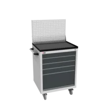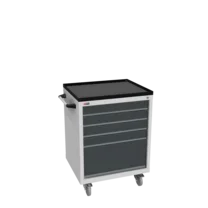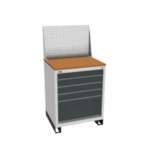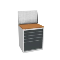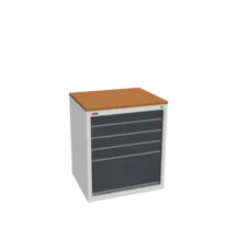 Инструментальная тумба с 5 ящиками: h100, h100, h100, h100, h300. Максимальная нагрузка на ящик — 60 кг. Телескопические направляющие. Тумба укомплектована столешницей, экраном с кронштейном и светодиодным светильником, электропанелью, а также подставками с цоколем. Сварной корпус тумбы и корпус ящика. Общий замок, закрывает все ящики.