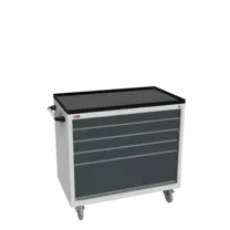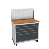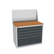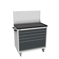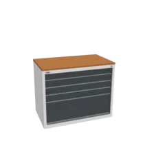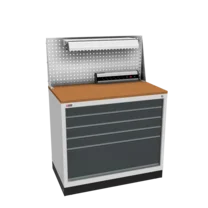 Инструментальная тумба с 5 ящиками: h100, h100, h100, h100, h300. Максимальная нагрузка на ящик — 60 кг. Телескопические направляющие. Тумба укомплектована столешницей, экраном с кронштейном и светодиодным светильником, электропанелью, а также подставками с цоколем. Сварной корпус тумбы и корпус ящика. Общий замок, закрывает все ящики.