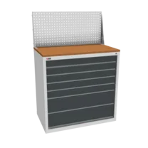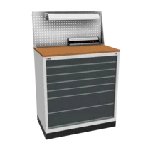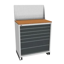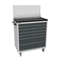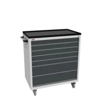 Инструментальная тумба с 7 ящиками: h100, h100, h100, h100, h100, h200, h200. Максимальная нагрузка на ящик — 60 кг. Телескопические направляющие. Тумба укомплектована колесами, лотком, боковой ручкой. Сварной корпус тумбы и корпус ящика. Общий замок, закрывает все ящики.