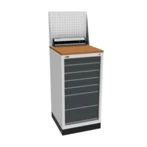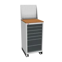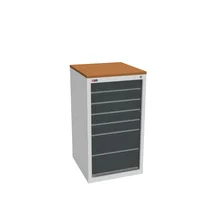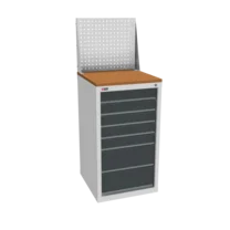 Инструментальная тумба с 7 ящиками: h100, h100, h100, h100, h100, h200, h200. Максимальная нагрузка на ящик — 60 кг. Телескопические направляющие. Тумба укомплектована колесами, лотком, ручкой на лоток. Сварной корпус тумбы и корпус ящика. Общий замок, закрывает все ящики.