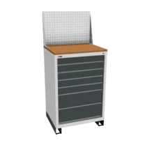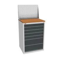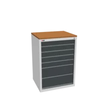 Инструментальная тумба с 7 ящиками: h100, h100, h100, h100, h100, h200, h200. Максимальная нагрузка на ящик — 60 кг. Телескопические направляющие. Тумба укомплектована колесами, лотком, боковой ручкой. Сварной корпус тумбы и корпус ящика. Общий замок, закрывает все ящики.