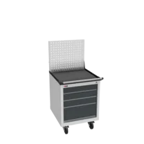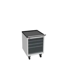 Инструментальная тумба с 4 ящиками: h100, h100, h100, h200. Максимальная нагрузка на ящик — 30 кг. Укомплектована колесами, лотком, ручкой на лоток. Сварной корпус тумбы и корпуса ящиков. Общий замок, закрывает все ящики. Телескопические направляющие.