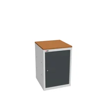 Инструментальная тумба с распашной дверцами и двумя полками. Укомплектована столешницей. Максимальная нагрузка на полку — 100 кг.