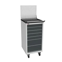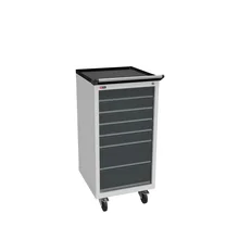 Инструментальная тумба с 7 ящиками: h100, h100, h100, h100, h100, h200, h200. Тумба укомплектована столешницей. Сварной корпус тумбы и корпуса ящиков. Общий замок, закрывает все ящики.