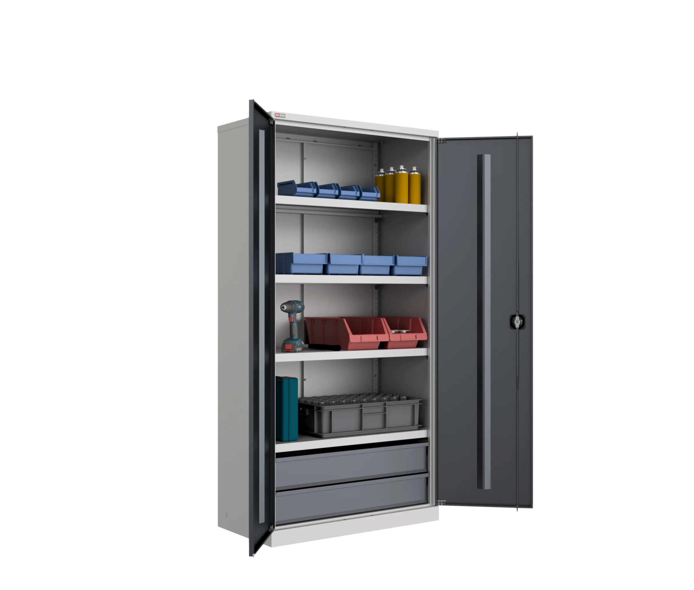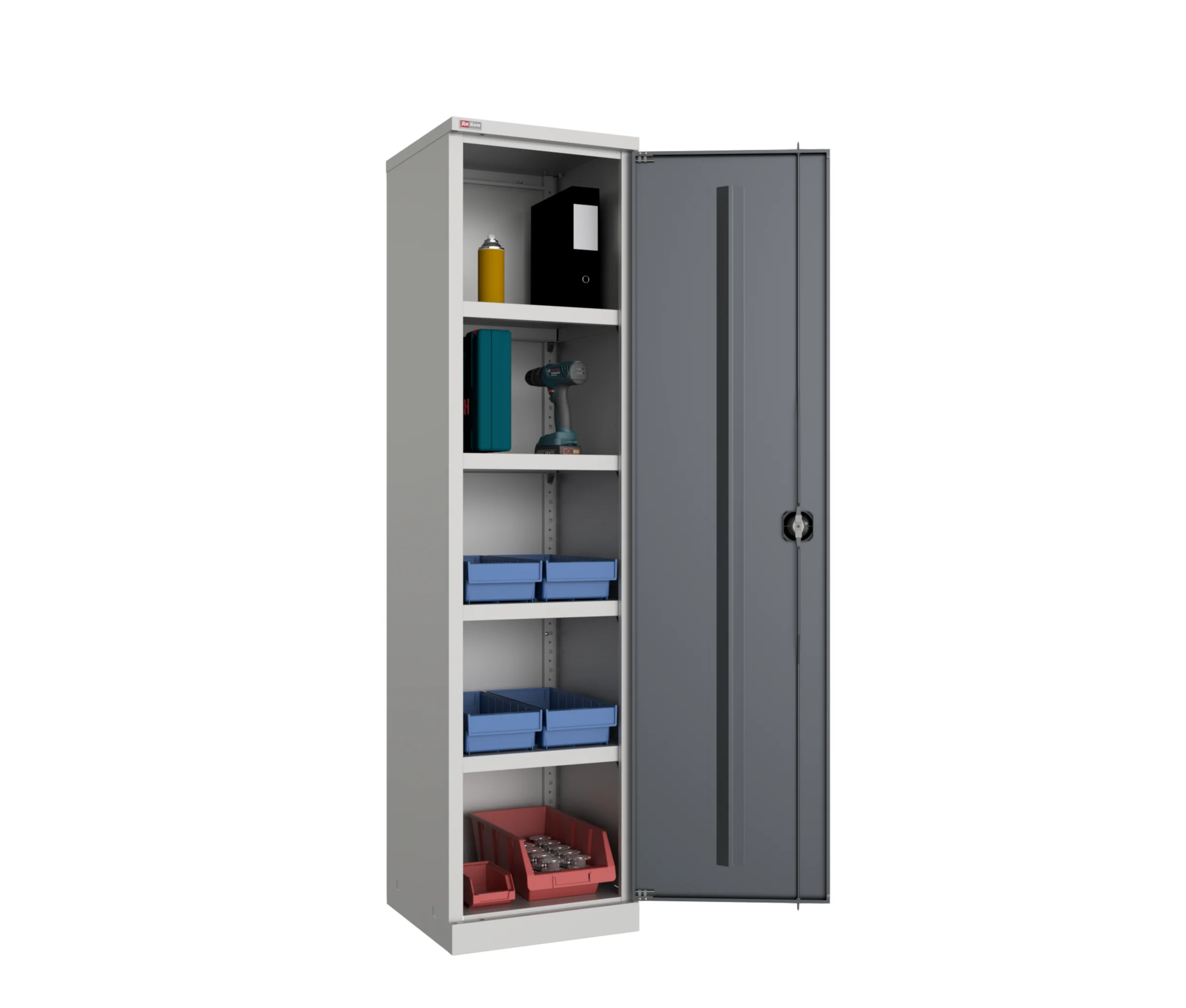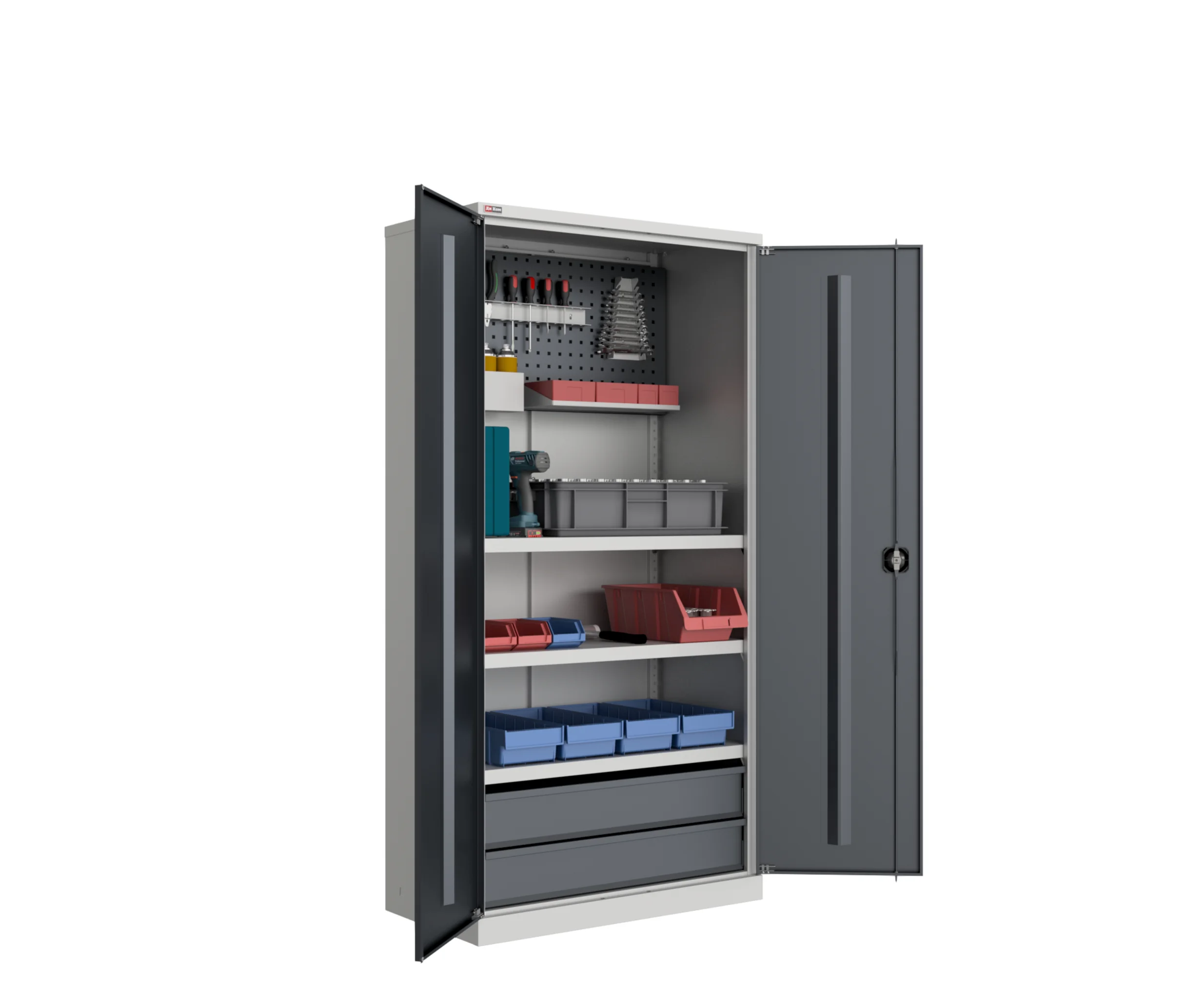 Шкафы оснащены полками с регулировкой по высоте. Несколько моделей укомплектованы сварными выдвижными ящиками. При этом полка выдерживает нагрузку до 60 кг, а ящик – до 35 кг. Чтобы инструменты и оснастка были всегда на видном месте, шкаф может комплектоваться перфорированным экраном.
